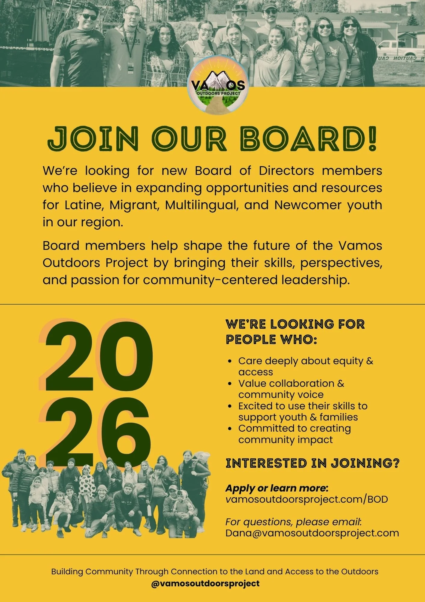 *Ser parte de la Mesa Directiva de Vamos Outdoors Project está diseñado para ser significativo, participativo y manejable. Los miembros contribuyen aproximadamente entre 30 y 40 horas al año a través de reuniones trimestrales por Zoom, participación en algunos eventos clave y días de programa, y conexión continua con nuestra misión y comunidad.